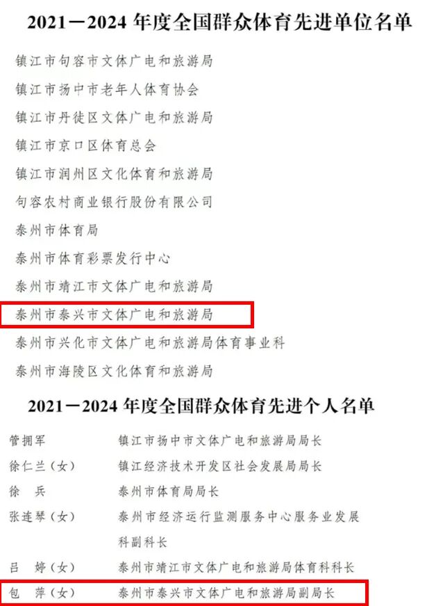 近日,全国群众体育先进单位先进个人、全国体育系统先进集体先进个人表彰大会召开,会上宣读了全国体育系统先进表彰决定、全国群众体育先进表彰决定,泰兴市文体广电和旅游局获评全国群众体育先进单位,泰兴市文体广电和旅游局副局长包萍获评全国群众体育先进个人。