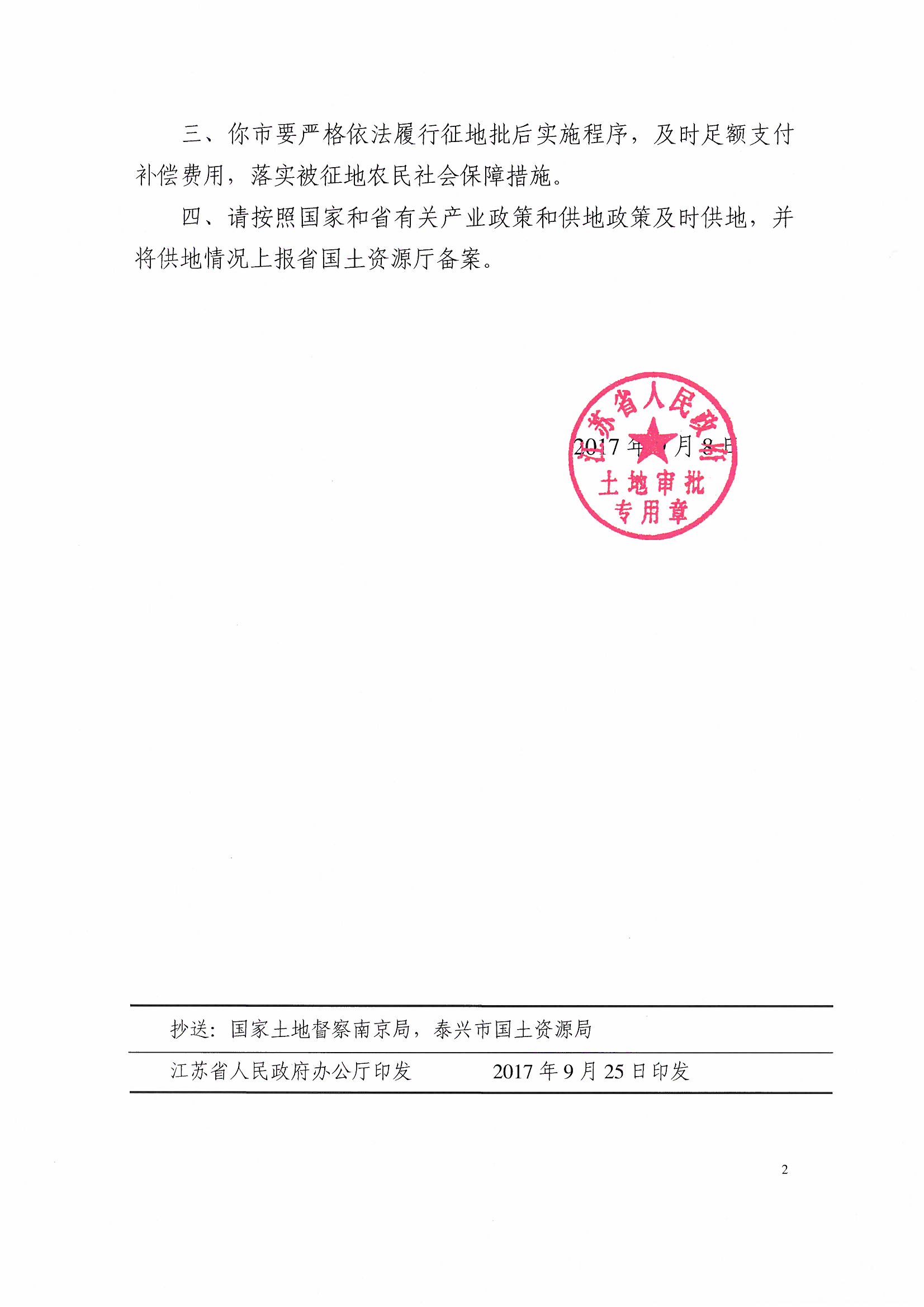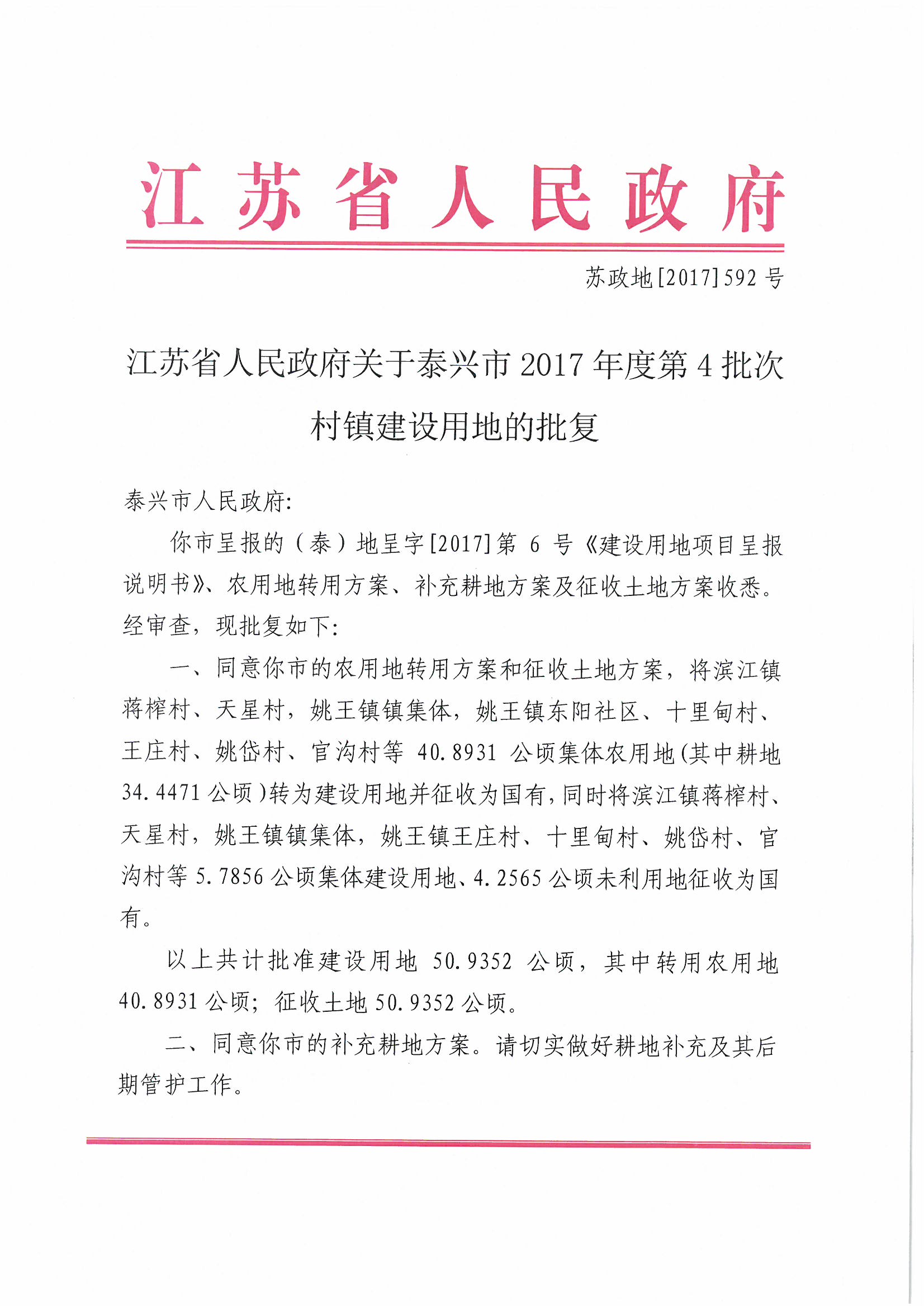 江苏省人民政府关于泰兴市2017年度第4批次村镇建设用地的批复