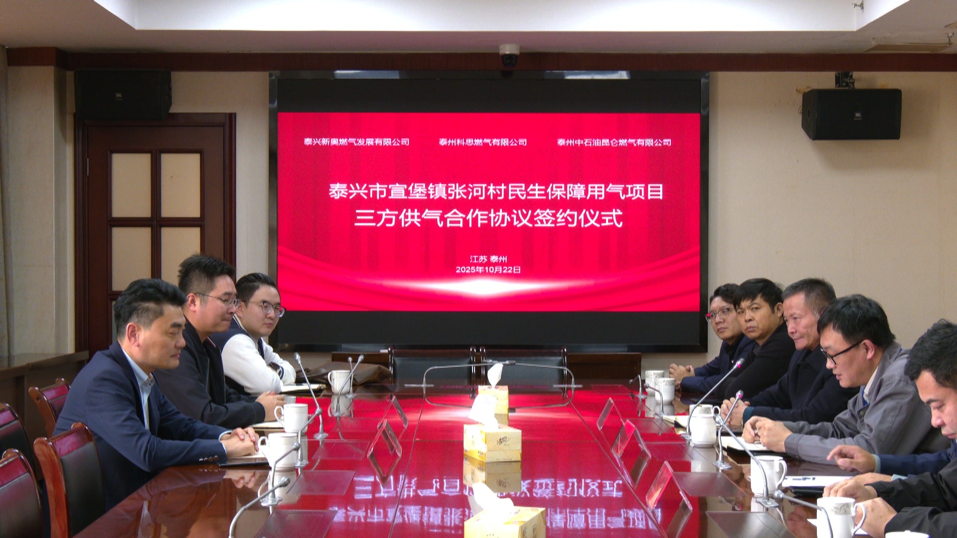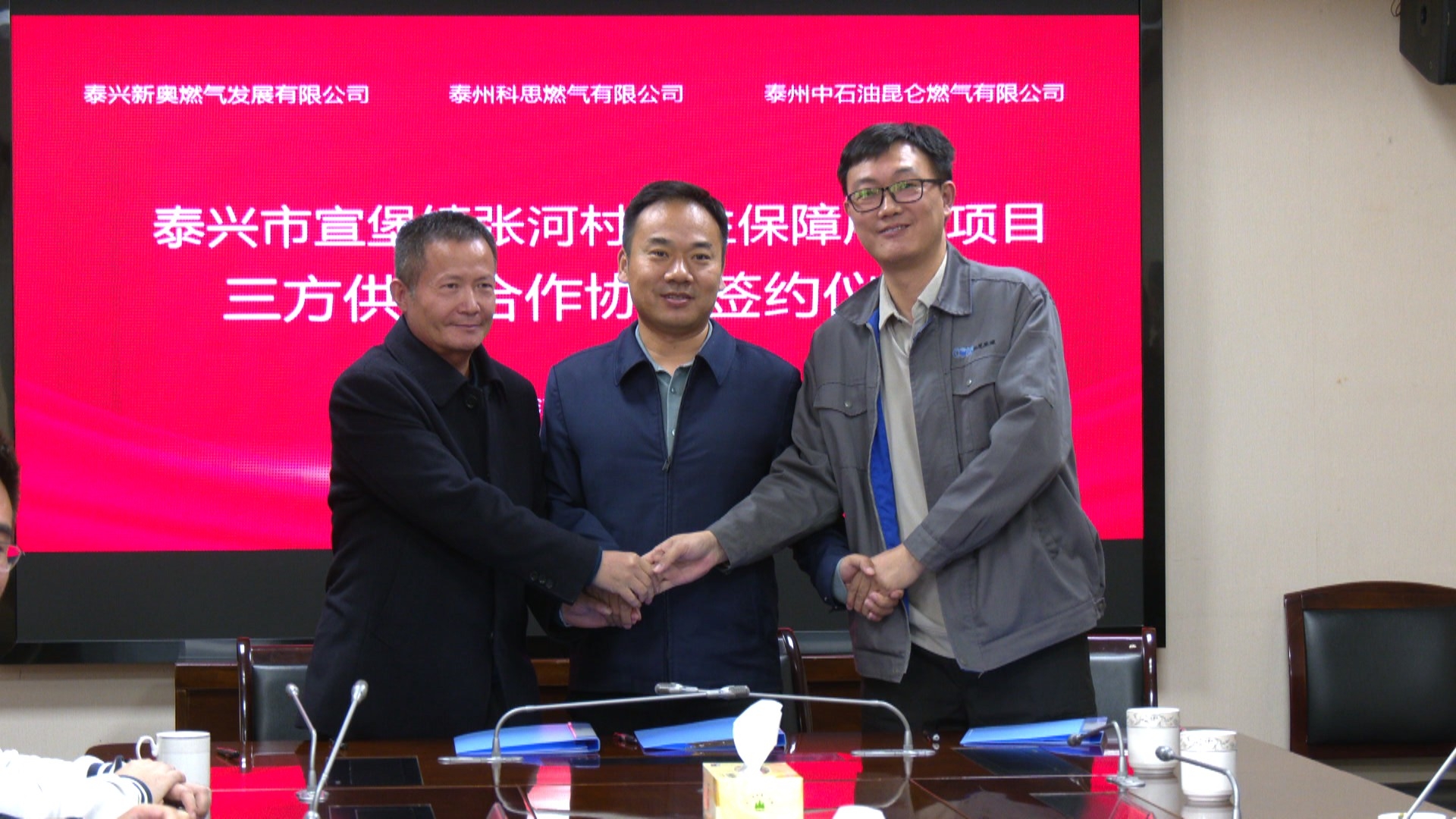 10月22日下午,在我市住建局与泰州医药高新区(高港区)住建局的共同见证下,泰兴新奥燃气与泰州科思燃气、泰州中石油昆仑燃气,正式签署宣堡镇张河村民生保障用气项目三方供气合作协议,着力解决当地村民燃气接入难题。