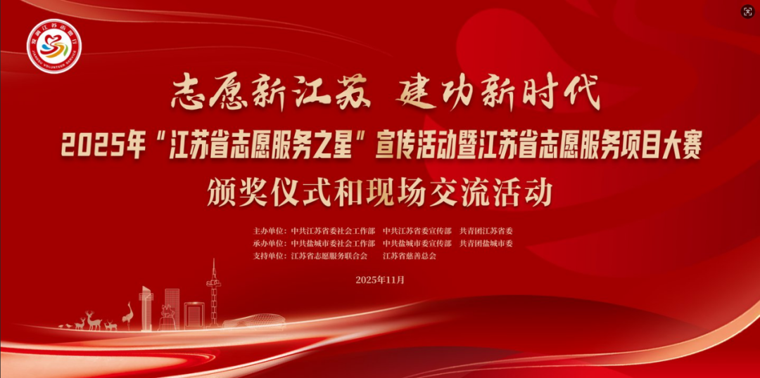 11月8日,由中共江苏省委社会工作部、中共江苏省委宣传部、共青团江苏省委共同主办的2025年“江苏省志愿服务之星”宣传活动暨江苏省志愿服务项目大赛颁奖仪式和现场交流活动成功举办。