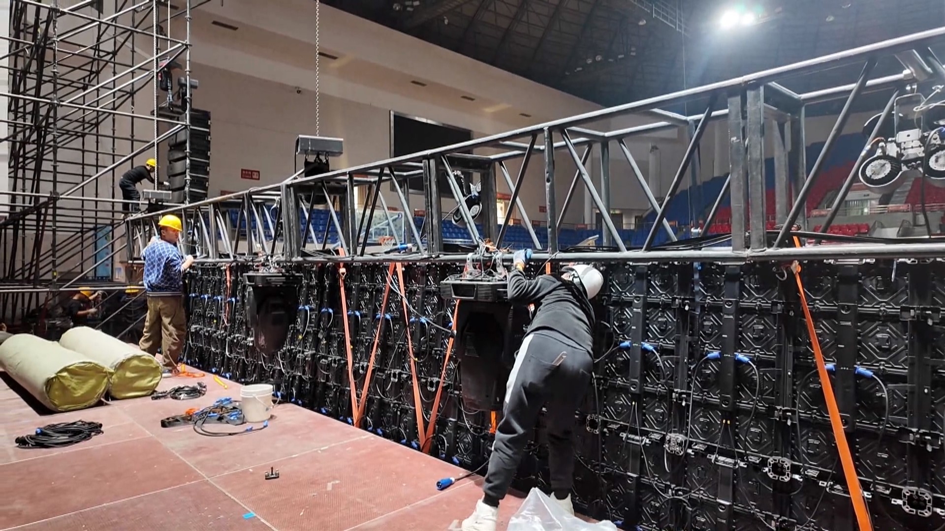 主场舞台已初具规模,整体视觉冲击力十足。据了解,舞台总长度达20米,特别采用室内三面舞台的创新设计,数字化灯箱与多层立体屏交互呈现,无论身处观众席哪个位置,都能沉浸式置身于音乐与光影交织的核心场域,不用担心错过舞台细节。
