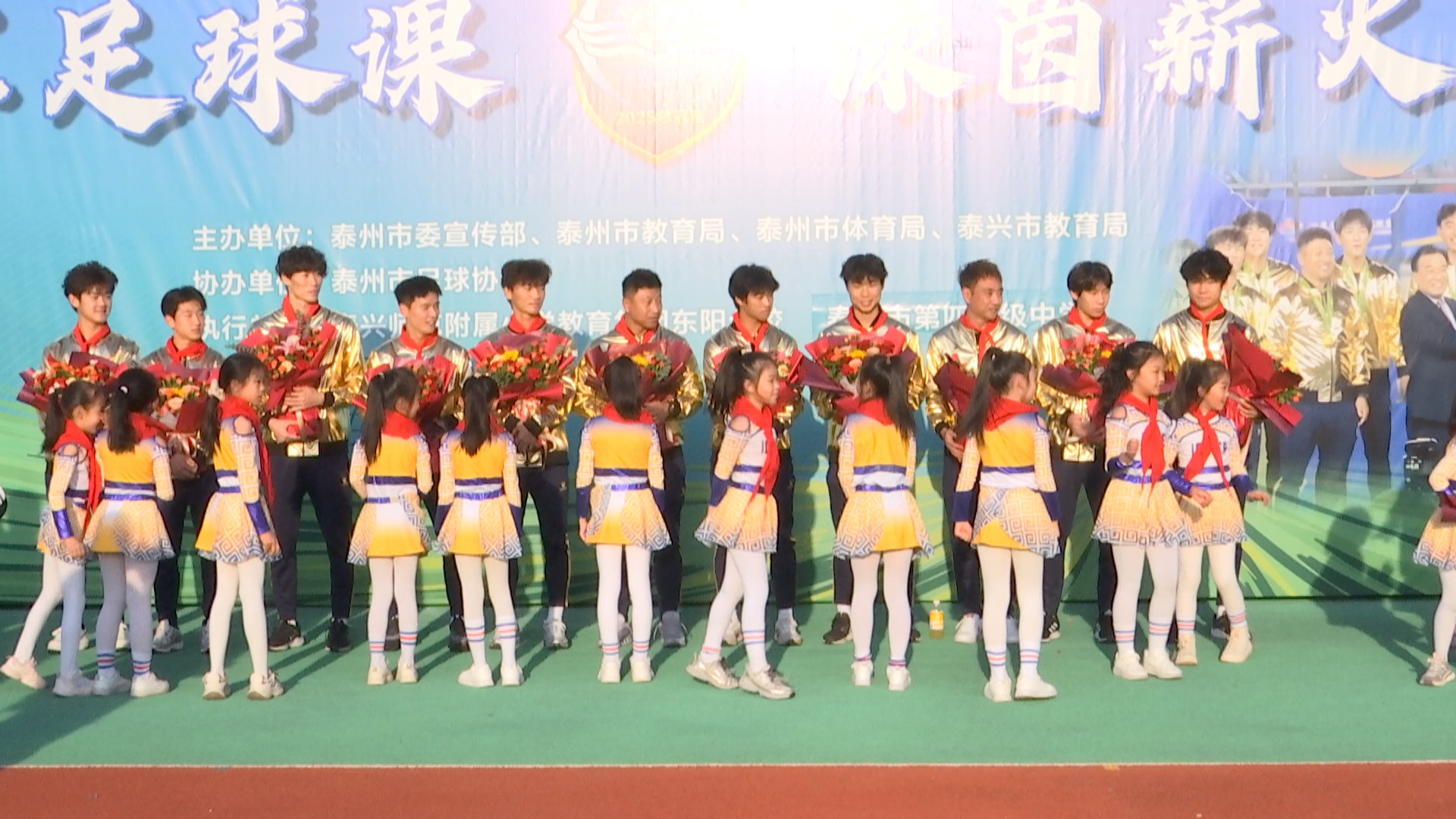 活动现场,学生代表为球员、教练系上鲜艳红领巾。随后,泰州队将士在足球和球衣上签名,将“冠军纪念”赠予学校。绿茵场上,球员们分组为校队队员做示范,拆解传控、突破、射门等动作的要领,耐心指导小球员。