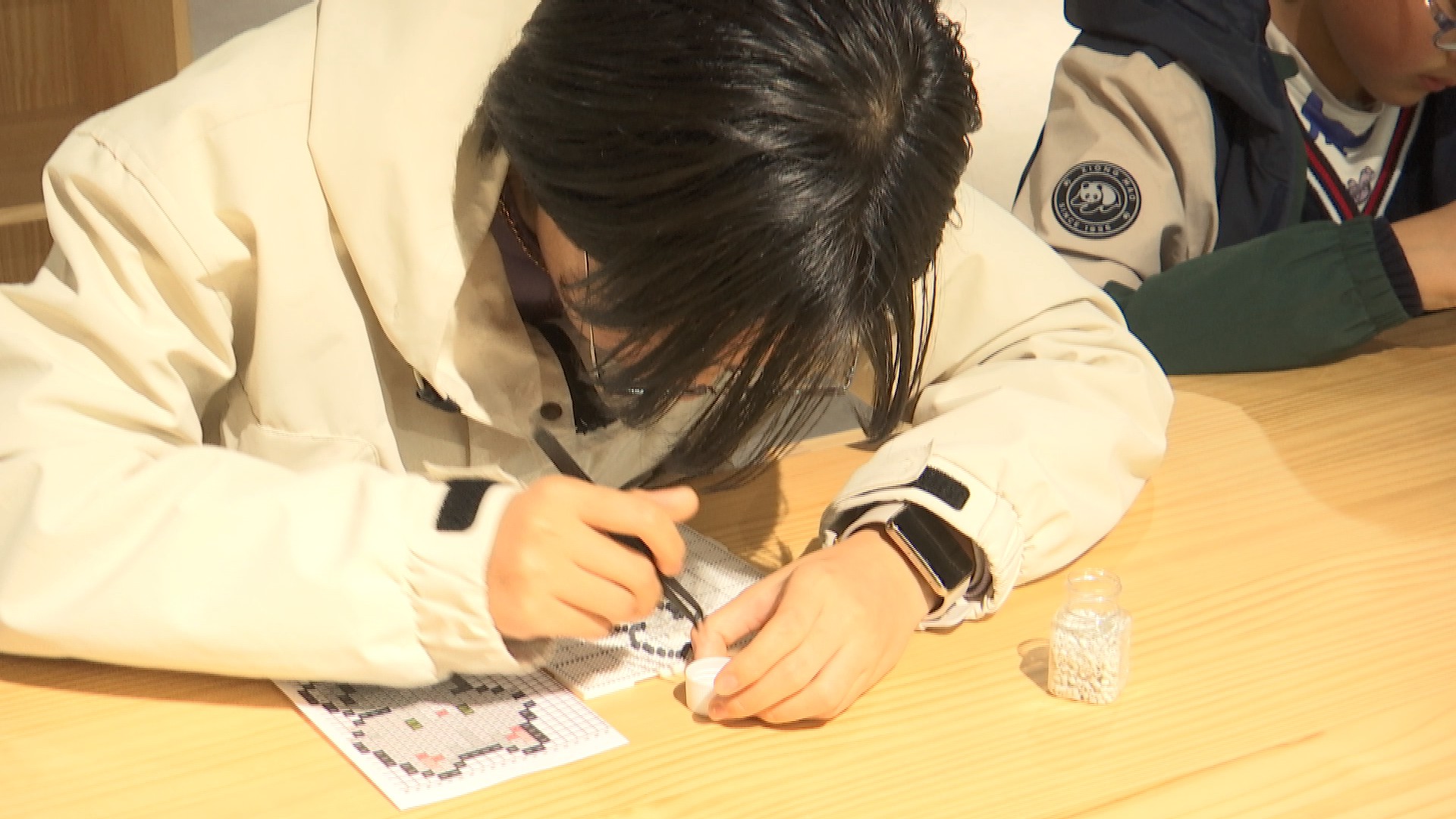 小学生黄艺涵接受采访时表示:“我对这个拼豆蛮有兴趣的,平时时间要练琴,要写作业,今天春假来玩一下,就觉得自己专注力提高了一点。”