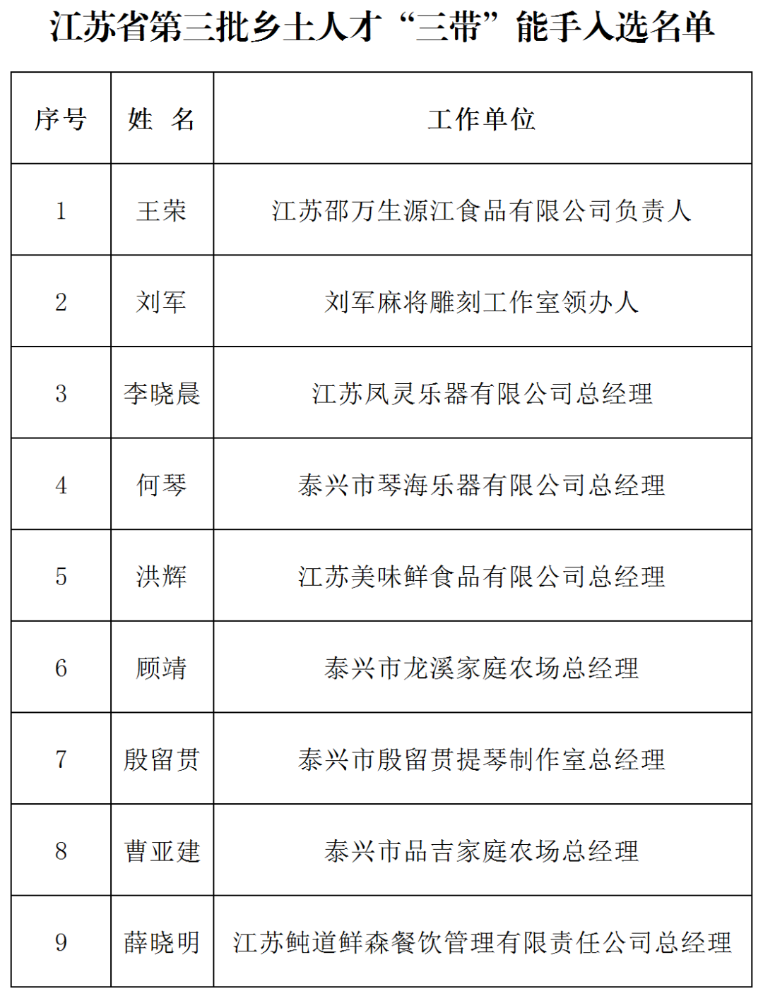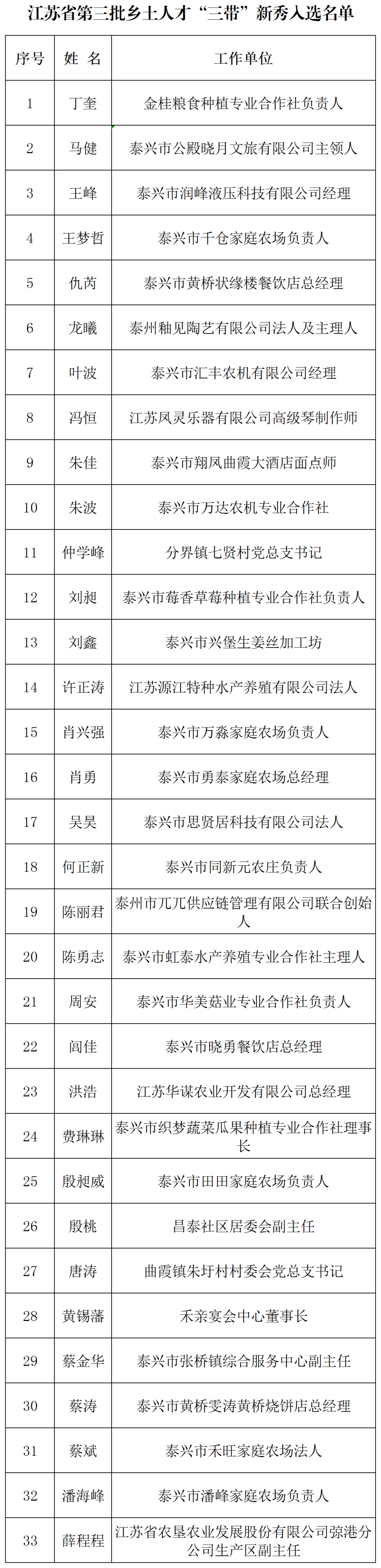 近年来,市委、市政府始终将乡土人才作为乡村振兴的“主力军”和“金种子”,持续推进乡土人才队伍建设,人才培育取得显著成效。前不久,江苏省第三批乡土人才“三带”培养对象评选中,泰兴7名名人、9名能手、33名新秀入选,入选数均列泰州第一。目前,全市拥有江苏省乡土人才“三带”名人9名、能手23名、新秀83名,“三带”人才队伍规模大幅增长。