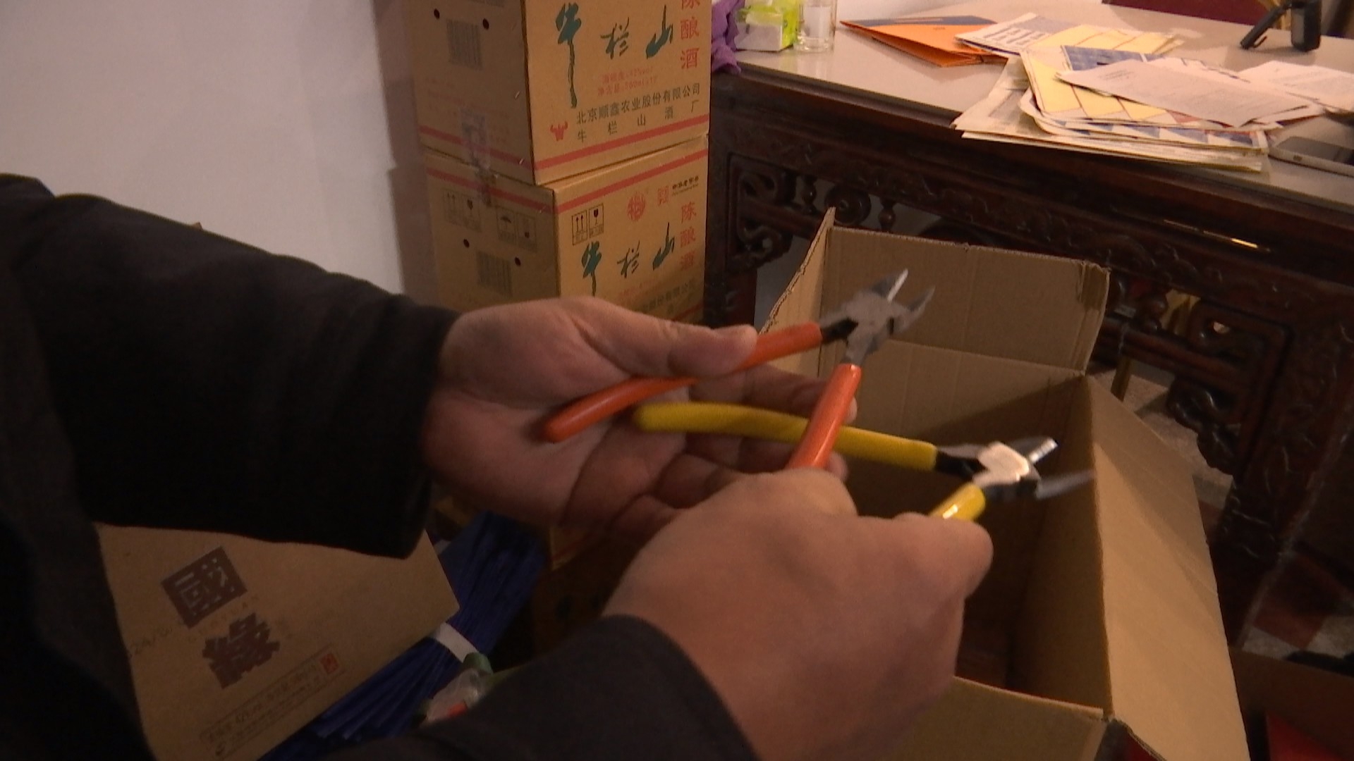 市场监督管理局城北分局副局长张云说:“这个是电烙铁、工具过滤的漏斗、焊接王就是胶水吧,电焊胶、盖章的铆钉、印章的生产日期的,钳子。”