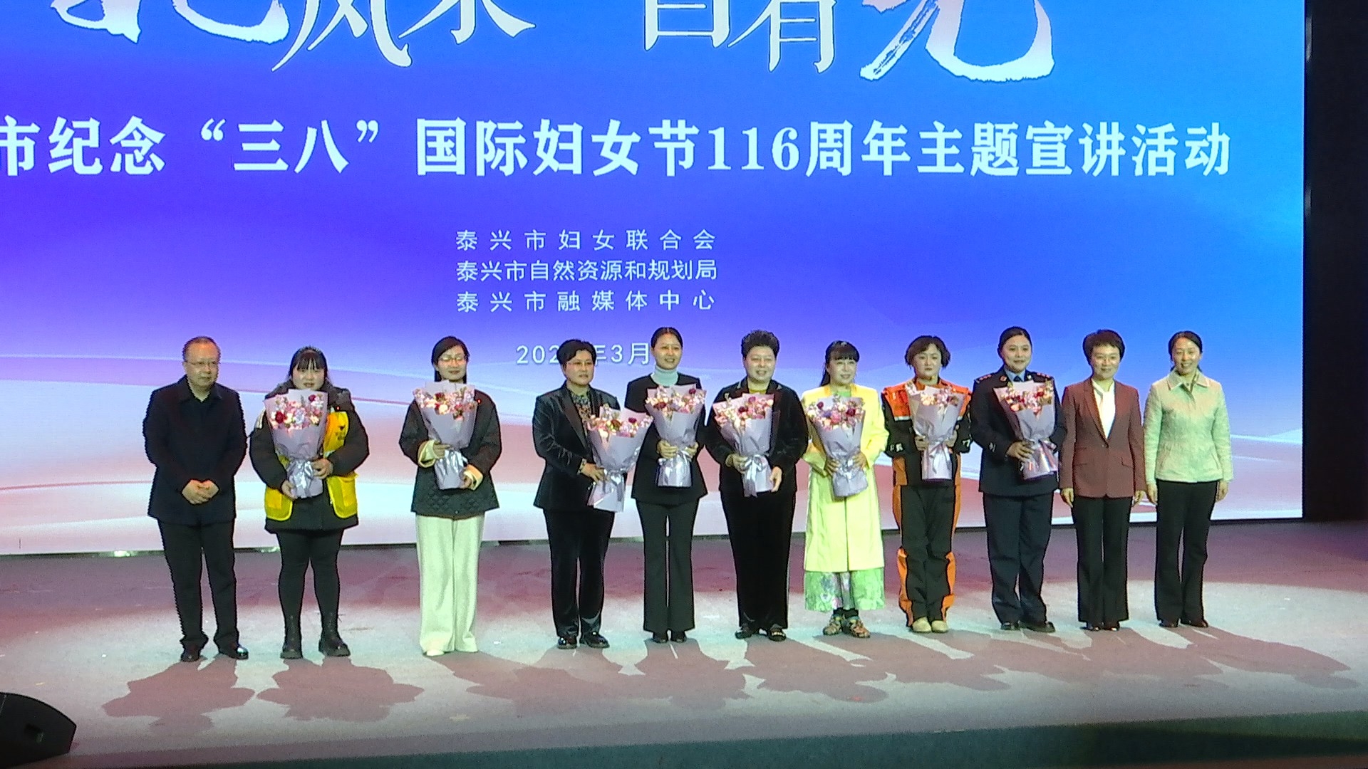 3月6日下午,我市举行纪念“三八”国际妇女节116周年主题宣讲活动。泰州市妇联主席李蓓、我市副市长惠星出席活动。