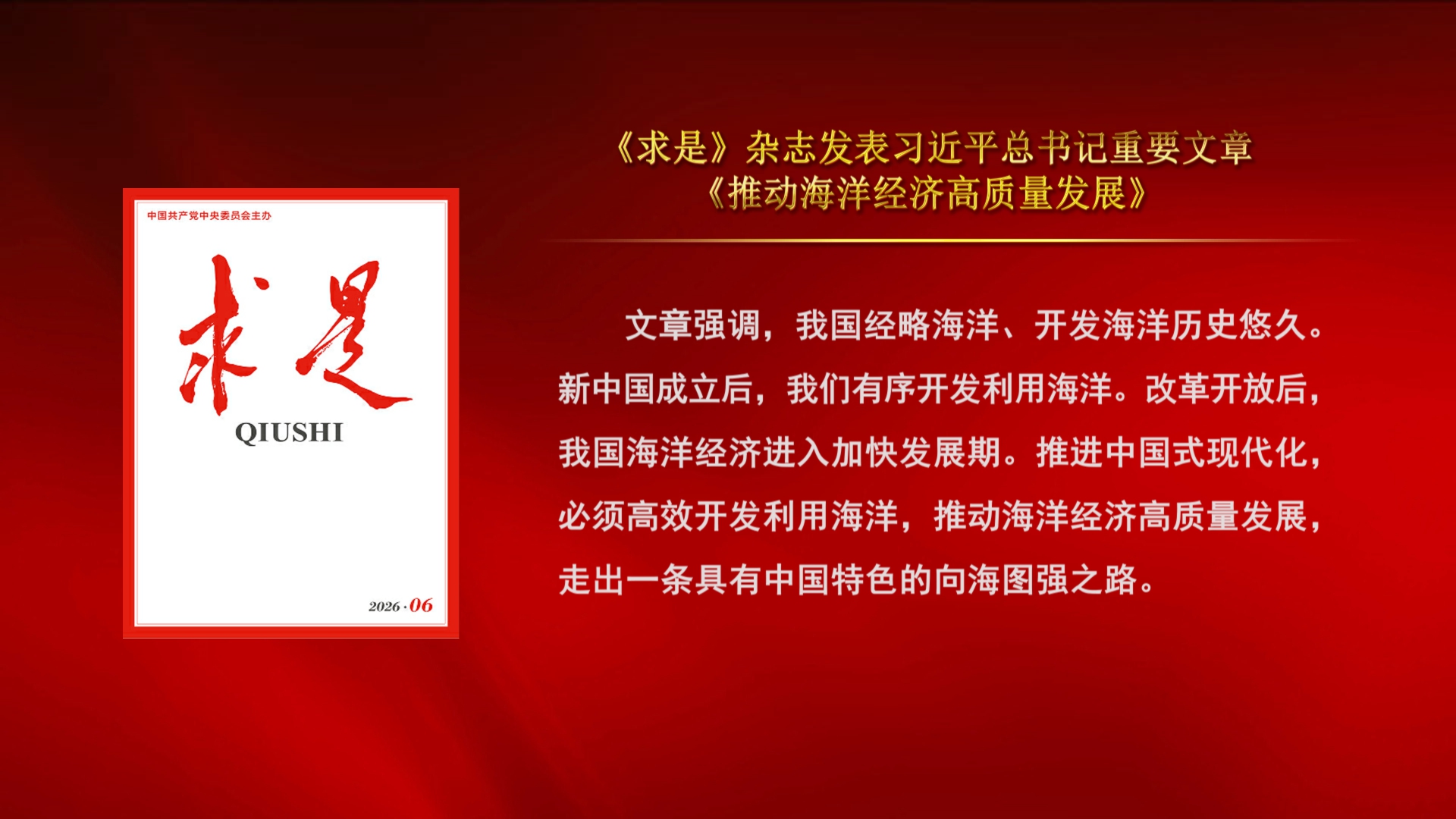 3月16日出版的第6期《求是》杂志发表中共中央总书记、国家主席、中央军委主席习近平的重要文章《推动海洋经济高质量发展》。