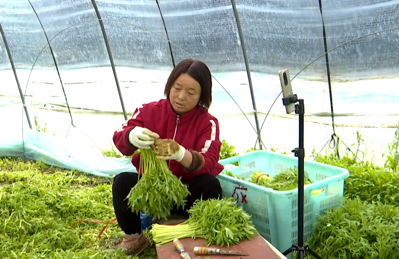 与此同时,秦庄村佃勇家庭农场的9亩芦蒿迎来采收季。大棚内,工人们忙着收割、整理芦蒿,一派繁忙景象。据介绍,农场目前每日采收芦蒿约200斤,市场价每斤3元左右。农场负责人沈志君介绍,芦蒿采收结束后,将及时播种空心菜、美苋等作物,抢抓农时赶种下一茬,力争早上市、增收益。