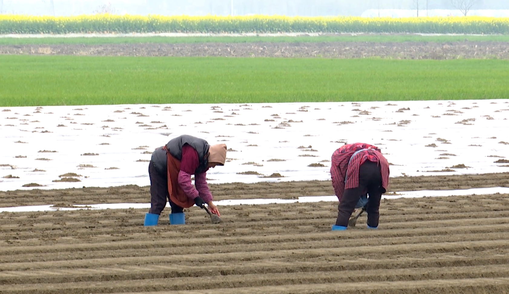 3月28日下午,黄桥镇新洋村学贤家庭农场内,一条条银白色地膜为土地披上“春装”。据悉,该地块种植的是毛豆,覆膜种植可起到增温保墒、抑制杂草的作用,能将毛豆上市时间提前约半个月。种植户表示,眼下正是春播关键期,抢抓农时播种,力争6月份顺利上市,期盼能有好收成、好价格。
