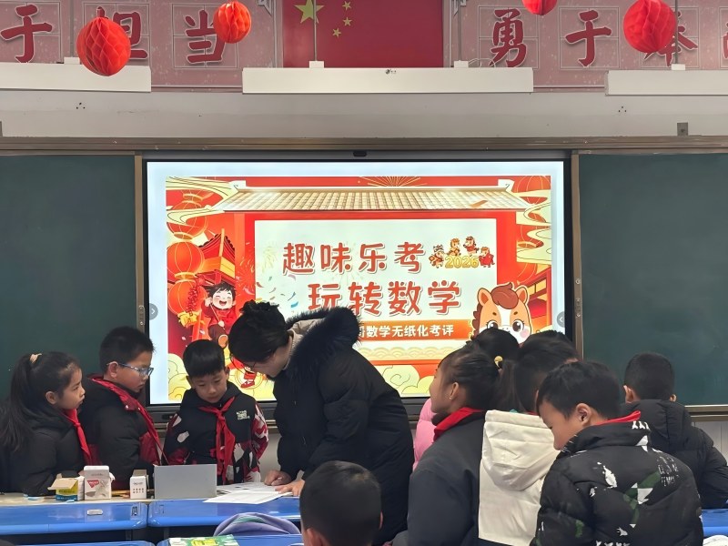 各学科测评均以趣味形式开展,数学围绕“趣味乐考,玩转数学”主题,设置糖葫芦口算、贴福辨方向、年货集市用人民币购物三大关卡;语文朗读测试中,学生随机抽取课文及必读书目片段展示,教师从字音、停顿等四维度现场打分;英语口语测试则以趣味化、情境化理念为核心,通过单词指读、认读、歌谣演唱等环节推进,让学生在游戏与互动中运用知识、大胆表达。