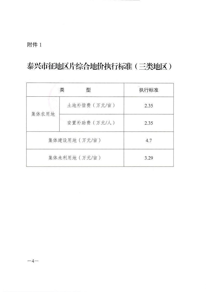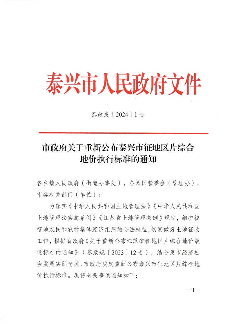 市政府关于重新公布泰兴市征地区片综合地价执行标准的通知
