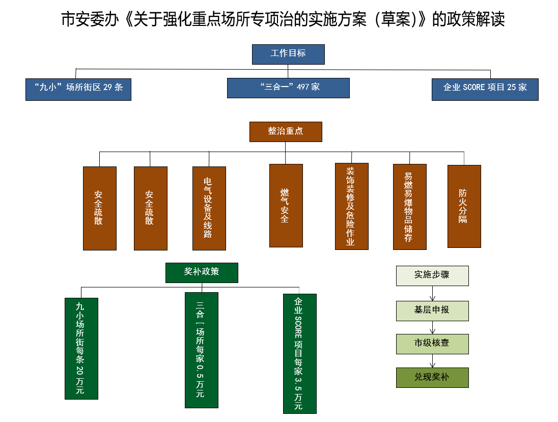 共明确3项任务。一是打造“九小”场所聚集街区29条。二是整改“三合一”场所497个。三是试点企业可持续发展项目25家。