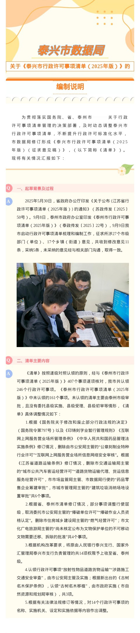 2025年5月30日,省政府办公厅印发《关于公布〈江苏省行政许可事项清单(2025年版)〉的通知》(苏政传发〔2025〕50号)。9月8日,泰州市政府办公室印发《泰州市行政许可事项清单(2025年版)》(泰政传发〔2025〕22号),9月9日我市启动行政许可事项清单梳理和编制工作,征求所涉27个市级部门(单位)、17个乡镇(街道)意见,共收到修改意见11条,采纳5条,未采纳的意见经与相关部门沟通,取得一致。