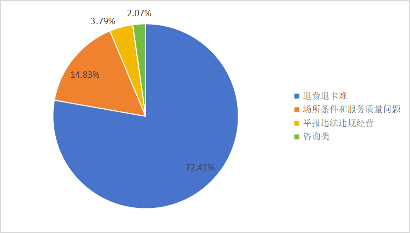 从本年度消费投诉的问题类型看,反映退费退卡难的共420件(占72.41%),反映场所条件和服务质量问题的共86件(占14.83%),举报违法违规经营的共22件(占3.79 %),咨询类12件(占2.07%)。