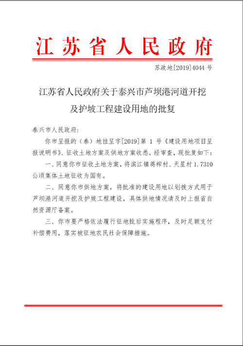 江苏省人民政府关于泰兴市芦坝港河道开挖及护坡工程建设用地的批复